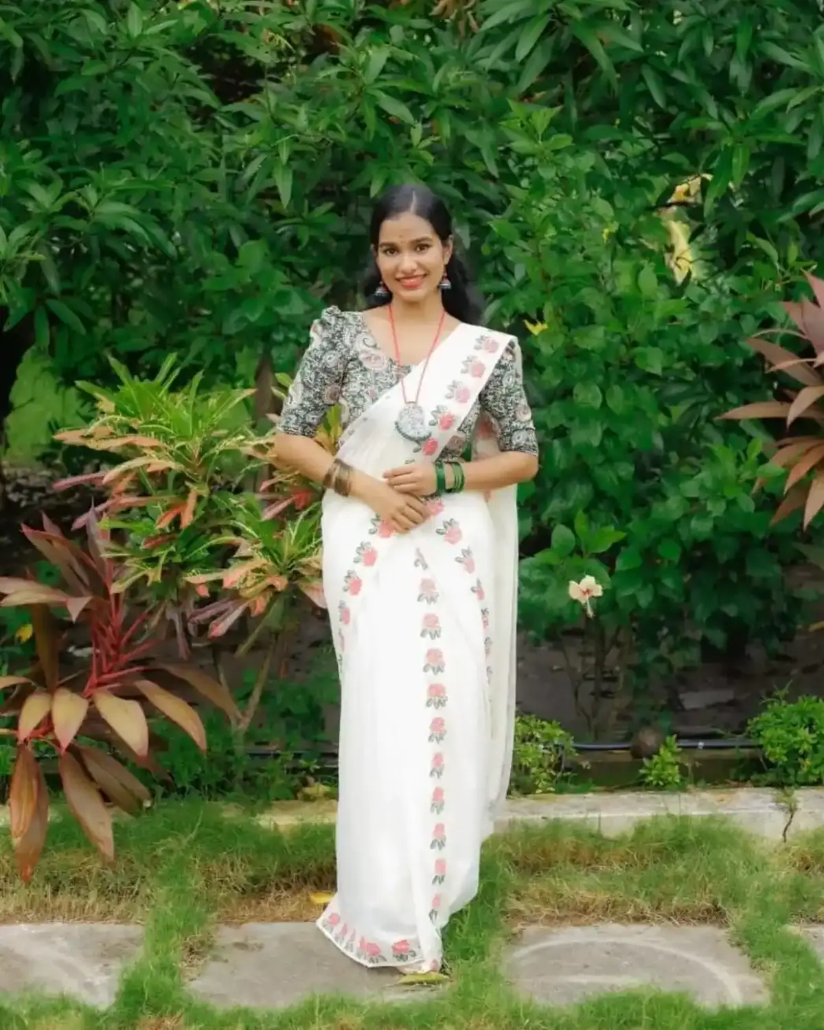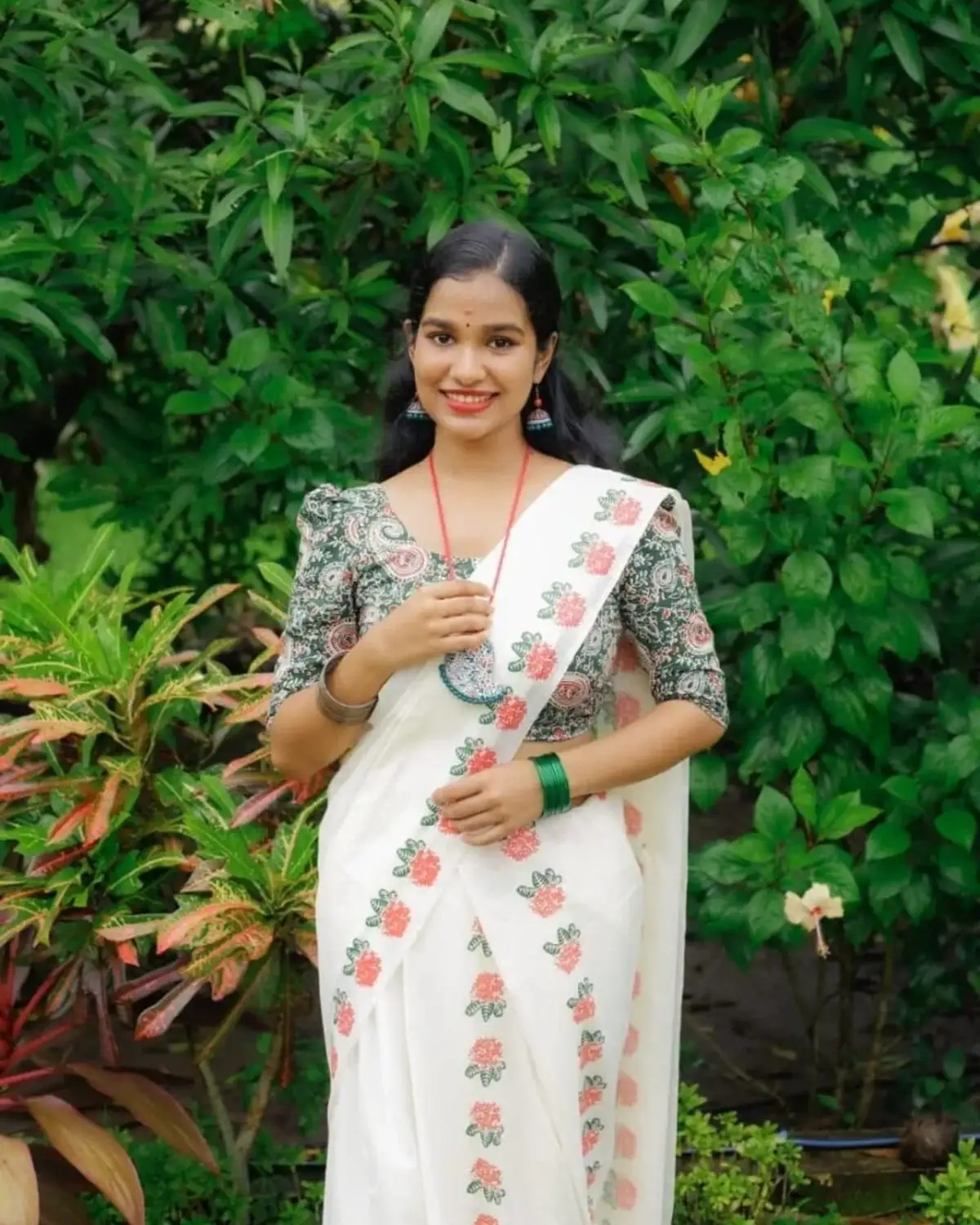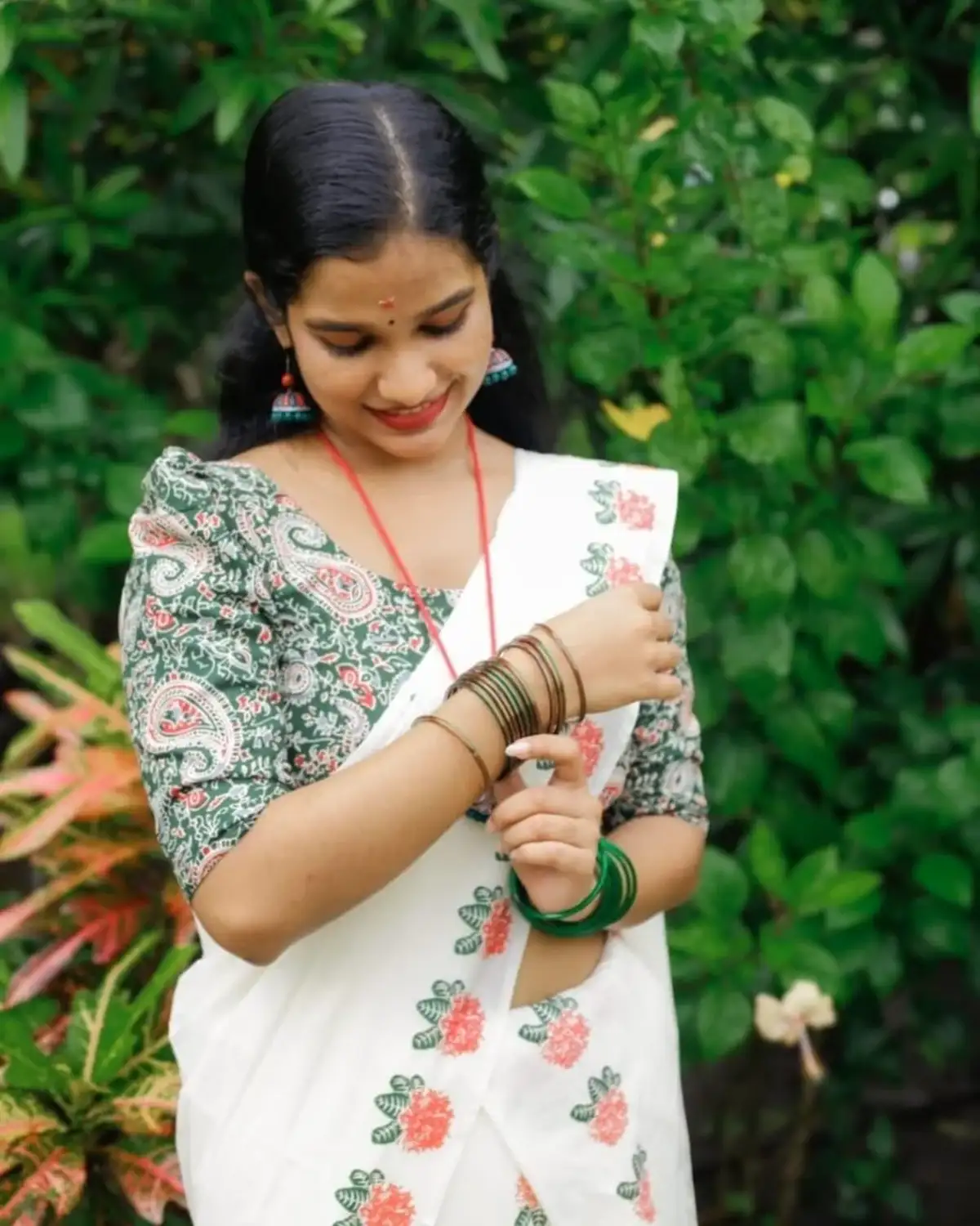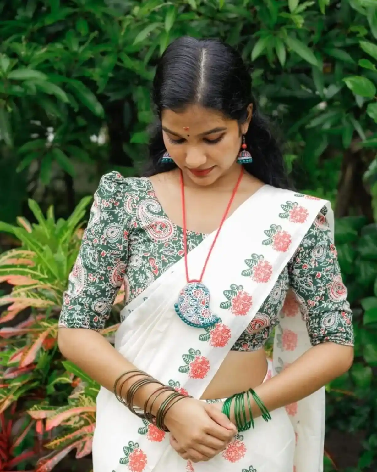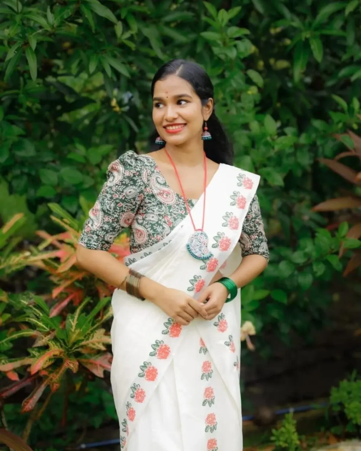 Chethi is a pure cotton premium chethi flower printed settmund with printed blouse material.It offers excellent comfort, breathability and a soft ,graceful drapes.