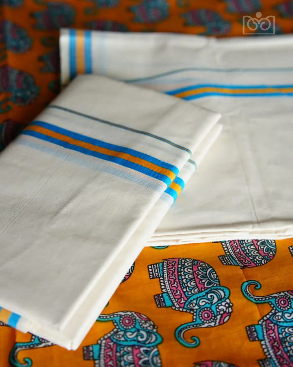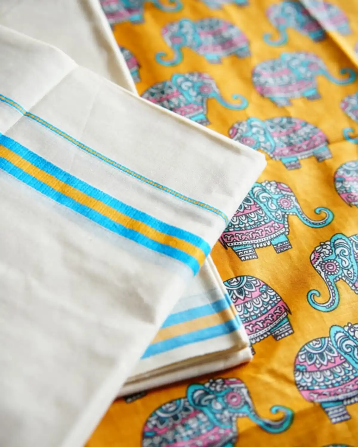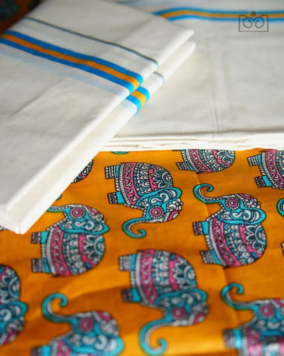 Gajamanthra is a pure cotton premium kattikkara settmund  with a elephant printed blouse material. It offers excellent comfort, breathability, and  a soft, graceful drapes.