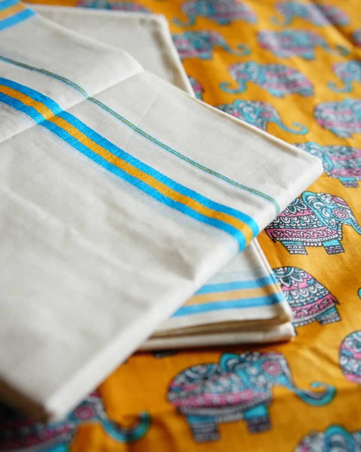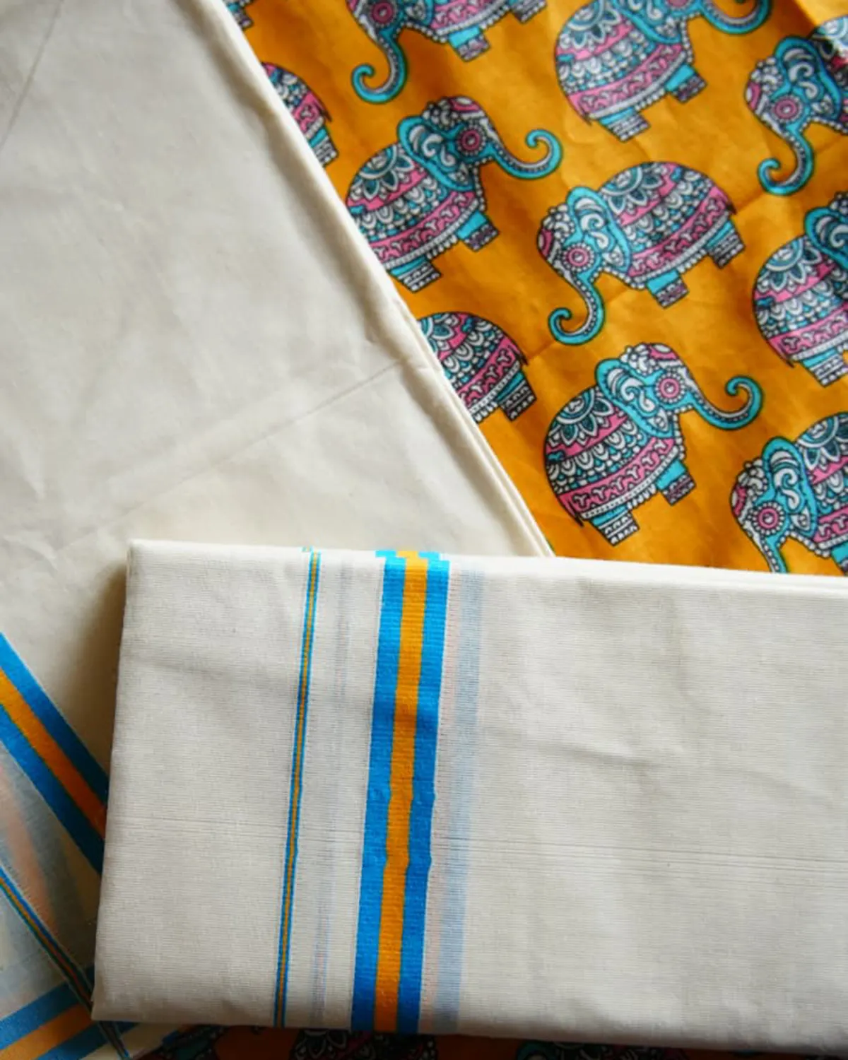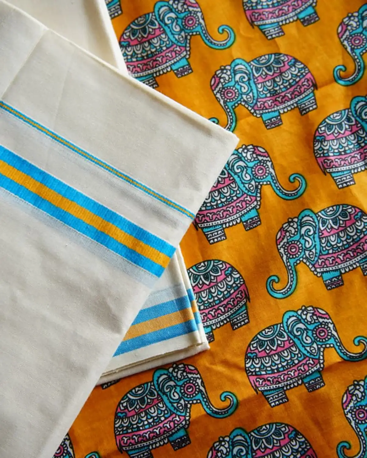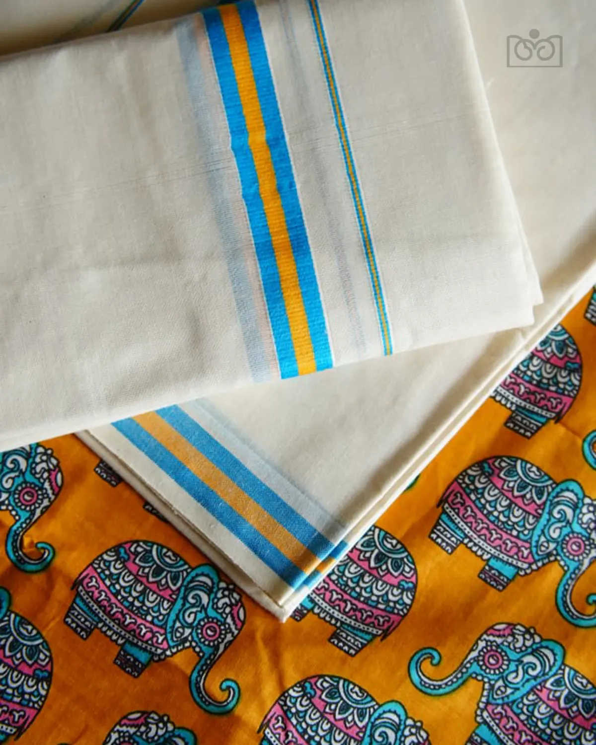 Gajamanthra is a pure cotton premium kattikkara settmund  with a elephant printed blouse material. It offers excellent comfort, breathability, and  a soft, graceful drapes.