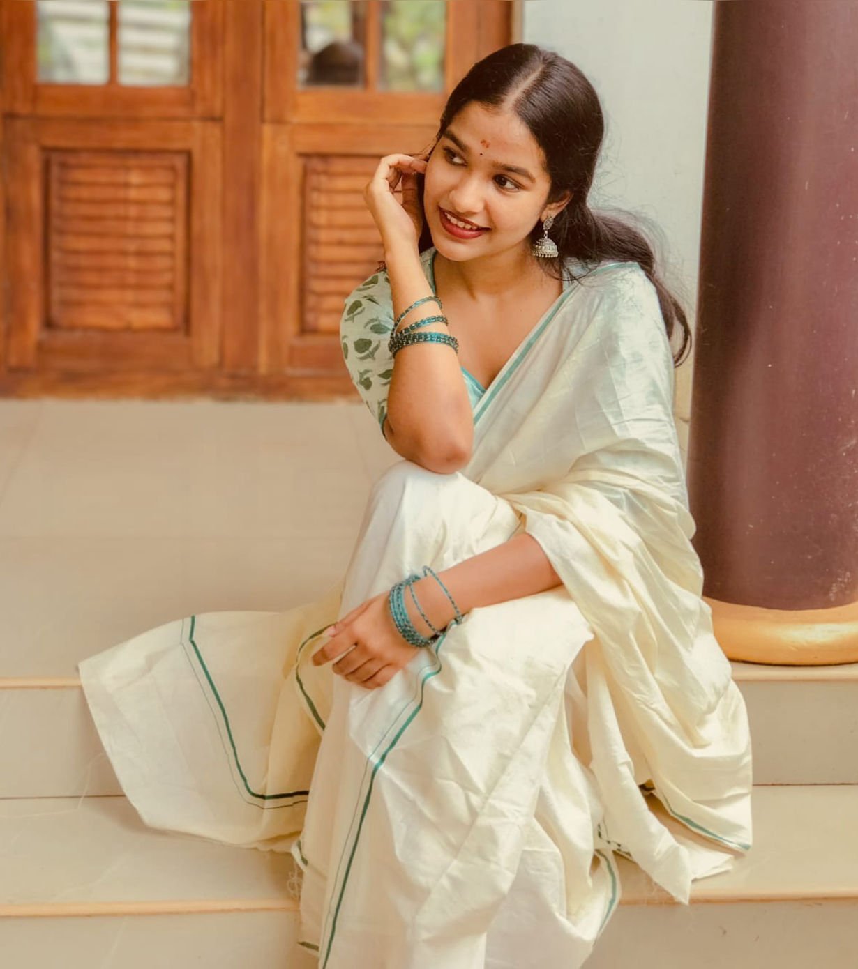 Pure cotton traditional kerala puliyilakkara settumund ( 1/4 inches ) with printed blouse material
