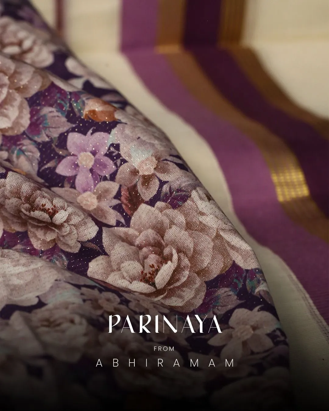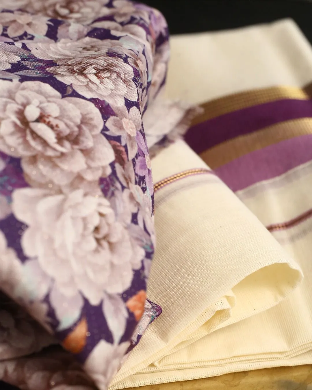 Laila embodies grace and sophistication through a mesmerizing blend of light and dark lavender tones, creating a serene and stylish look that stands out effortlessly. Crafted from premium kasav fabric, this elegant settumund combines Kerala’s traditional charm with a modern pastel touch.