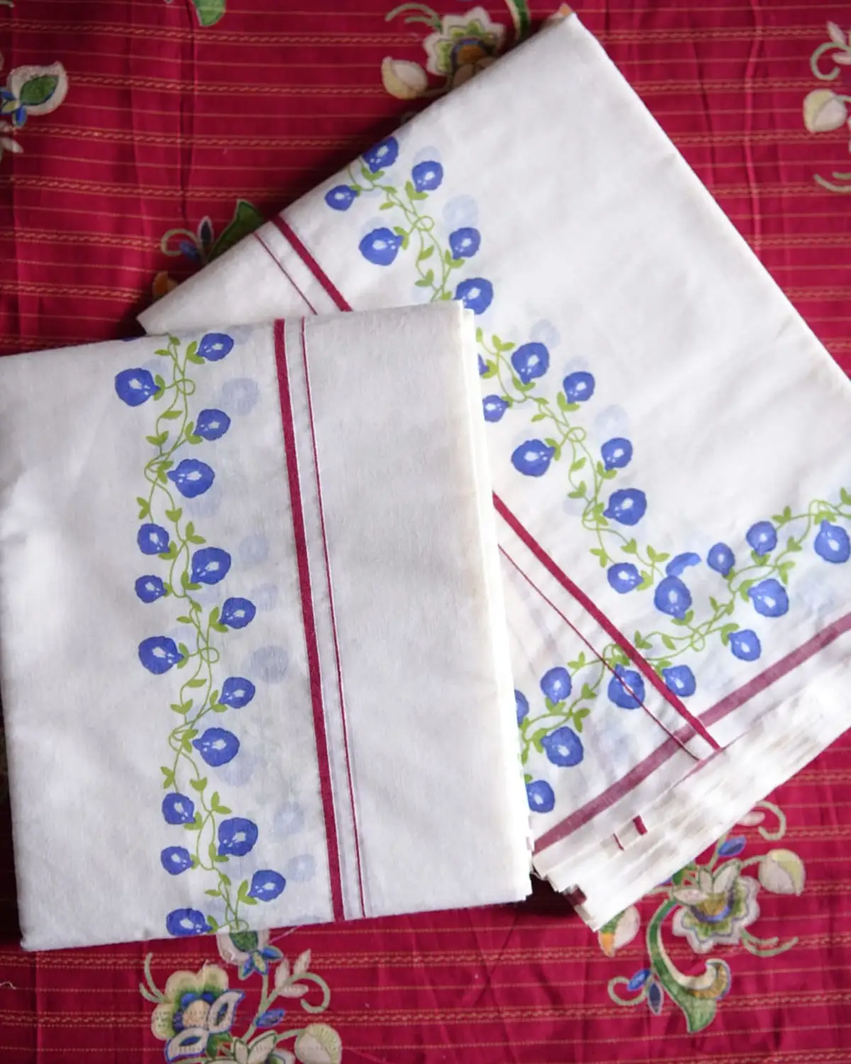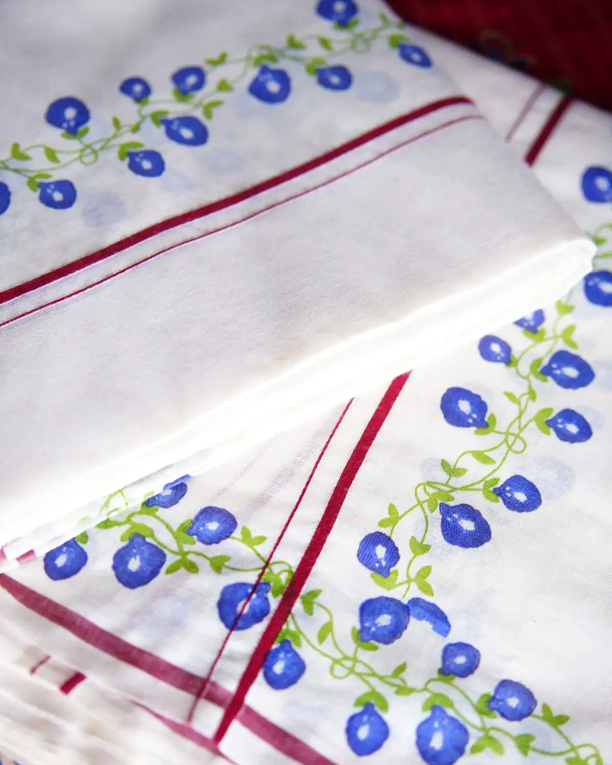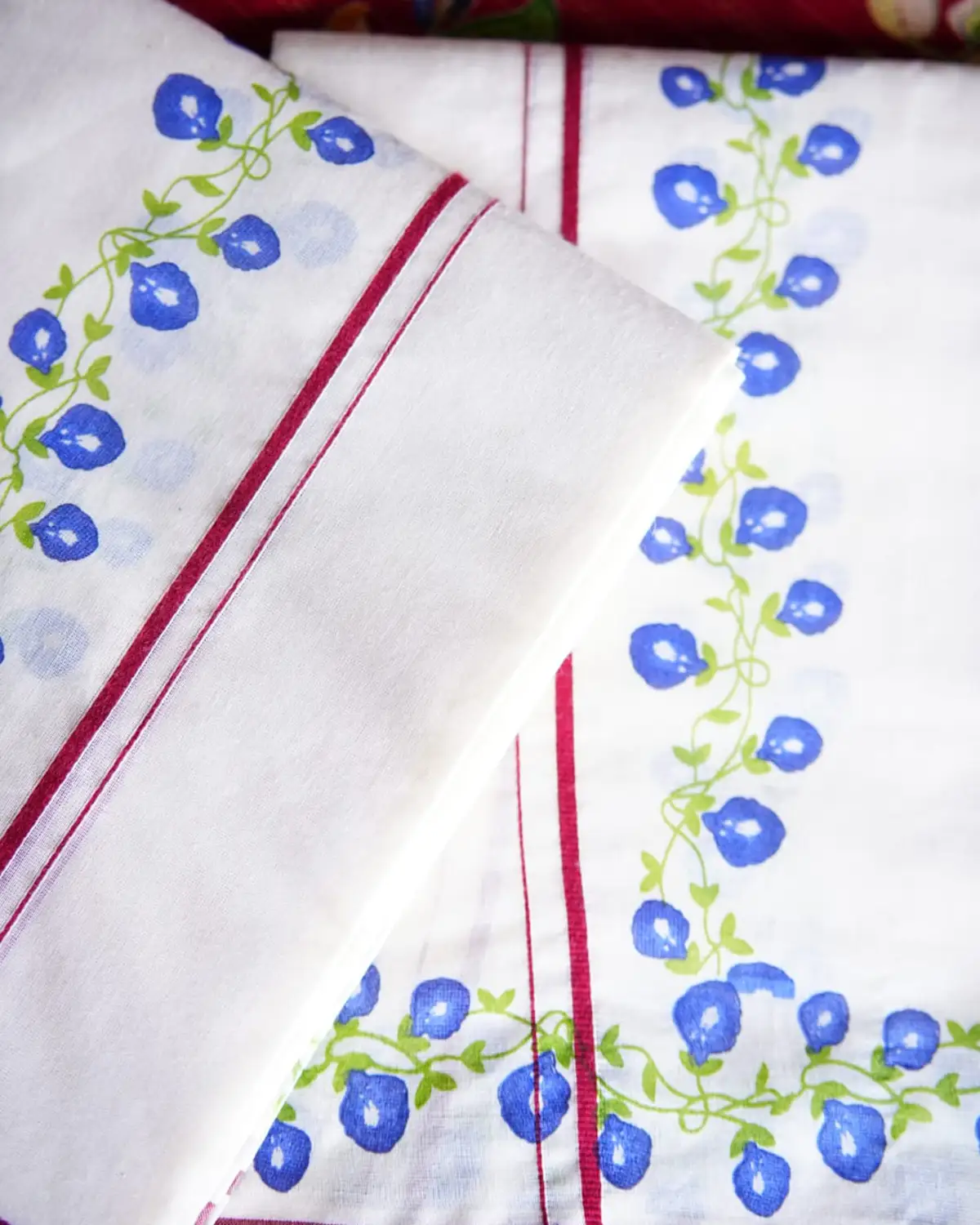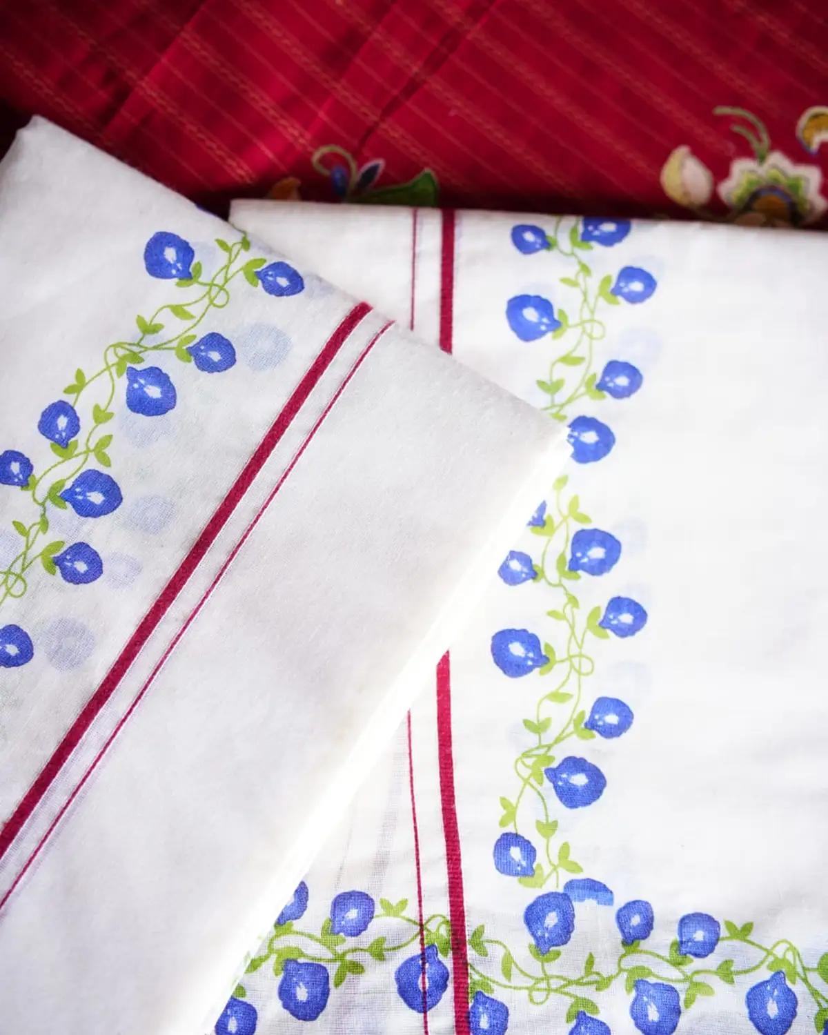 Shankupushpam printed at maroon puliyilakkara settmund paired with designer blouse material.