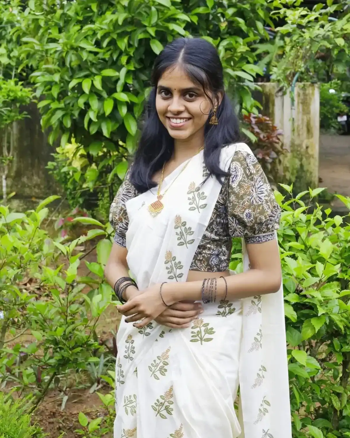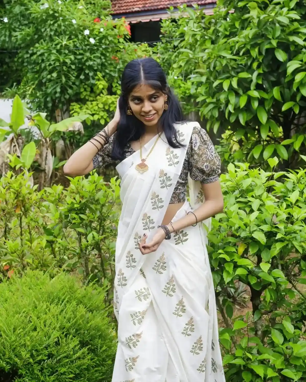 Woven from soft, breathable cotton, Thulasi features a refined puliyilakkara pattern enriched with elegant motifs that reflect the serenity of nature and the vibrancy of floral artistry. The gentle ivory base paired with glistening kasavu borders brings out a classic, ethereal look that’s both traditional and contemporary.